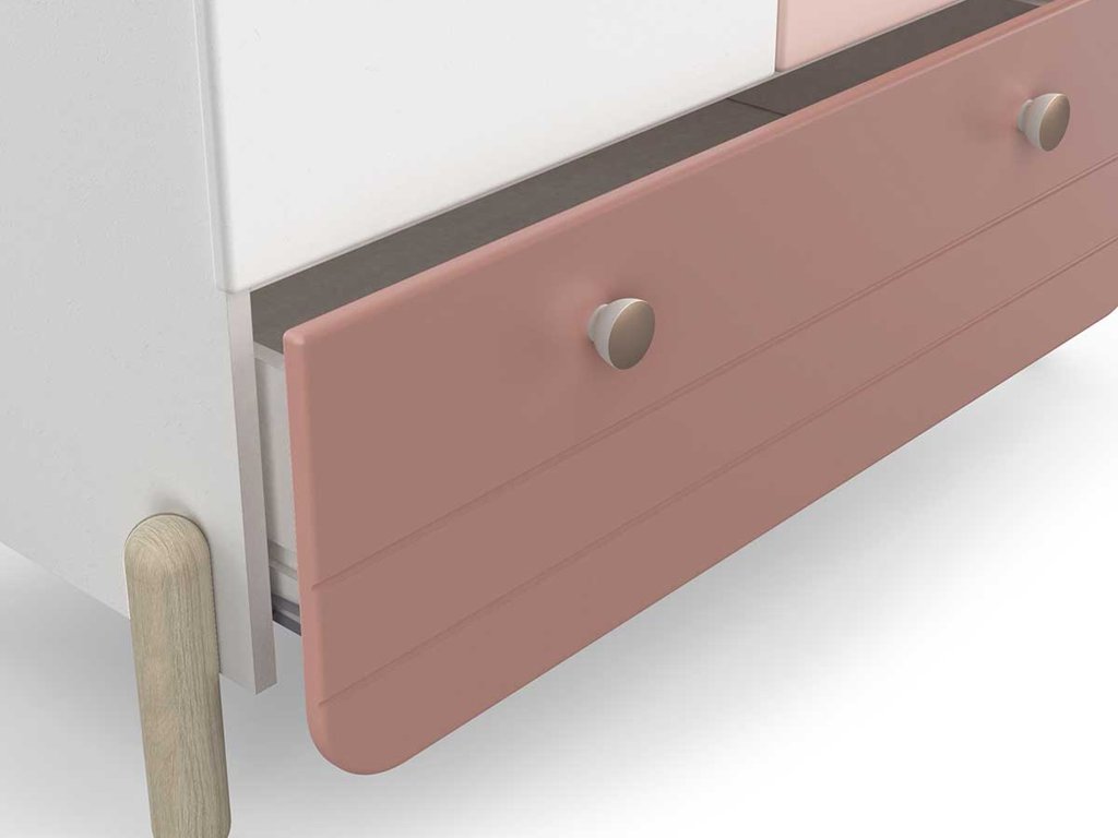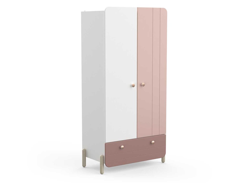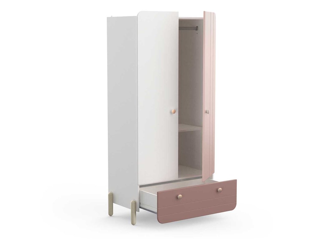 A Jade gardróbszekrény nagyszerű megoldás lányok szobájába, ahol a finom dizájn, a biztonság és a praktikum is fontos szempont. A fehér és púderrózsaszín színek kombinációja, valamint a tölgyfa lábak modern, mégis nyugodt összhatást teremtenek. A szekrény lekerekített formái csökkentik a sérülésveszélyt, és növelik a biztonságot a gyerekszobában.