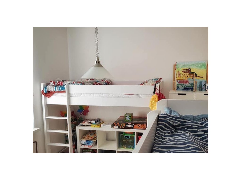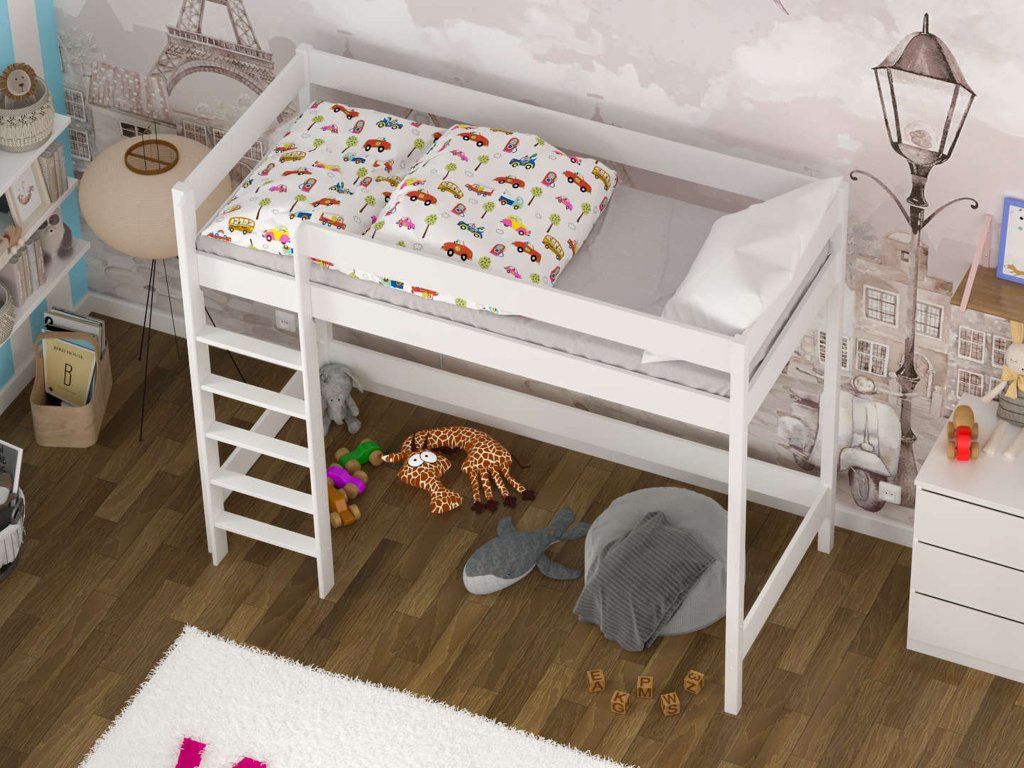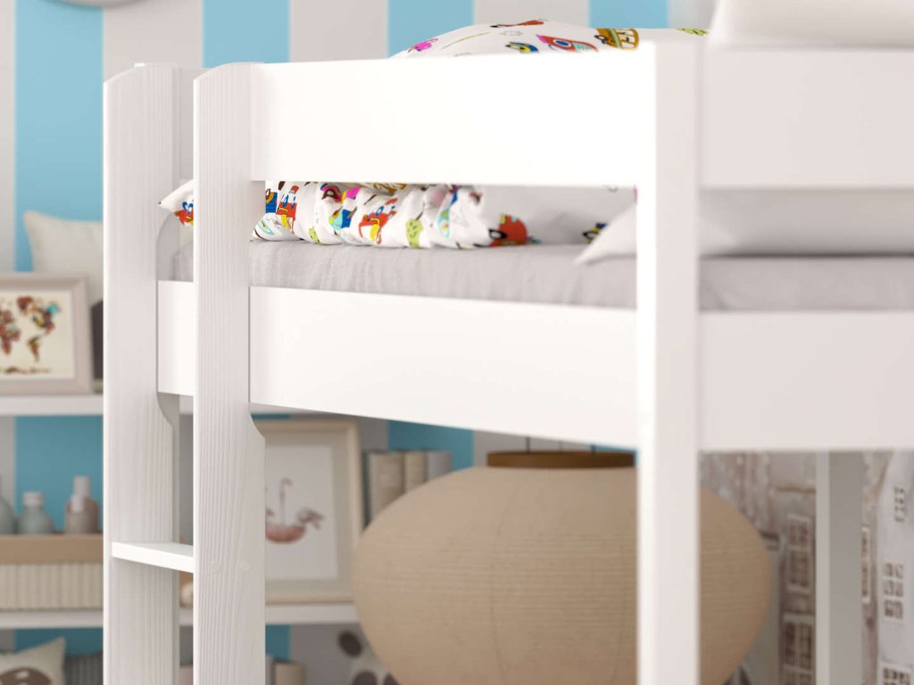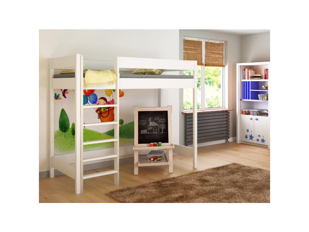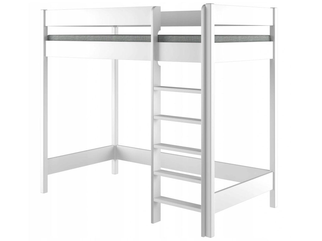 Praktikus emelt ágy semleges fehér színben. Tömör fa és bútorlapból készült galériaágy, jobb és bal oldalas is. Annak a ténynek köszönhetően, hogy az ágy megemelt ággyal rendelkezik, az alsó részén szabad teret kínál gyermekeinek a tanuláshoz, a játékhoz vagy a pihenéshez. Az ágyon lévő létra kétoldalas. Ágyrács teherbírása 150 kg.