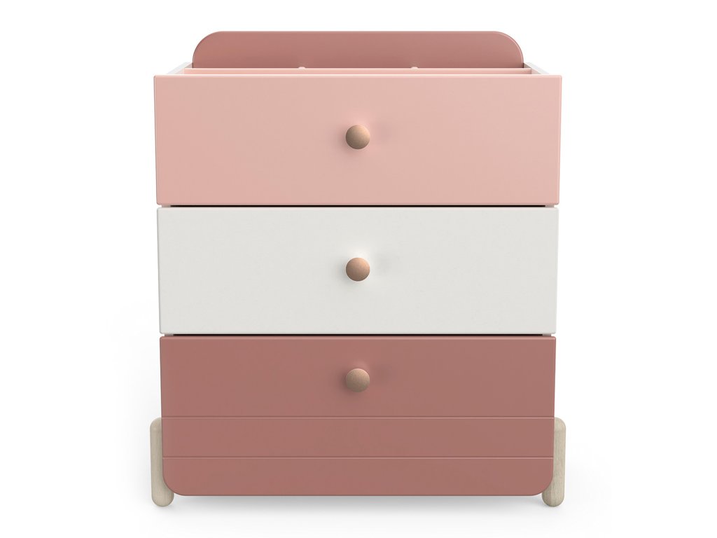 A vidám Jade komód minden gyerekszobát feldob, és egyúttal praktikus tárolóhelyet is biztosít a kisebb-nagyobb apróságok számára. Finom színkombinációja – matt rózsaszín és fehér – üde, nyugalmat árasztó hangulatot teremt a helyiségben. A lekerekített formák gyengéden hatnak, és a biztonságot is növelik a mindennapi használatban, hiszen nincsenek éles sarkok vagy váratlan ütközések. A komód felső része négy nyitott rekeszre oszlik, ahol a gyerekek átláthatóan elrendezhetik a ceruzákat, ékszereket, kiegészítőket vagy más olyan apróságokat, amiket mindig kéznél szeretnének tartani. Három mély fiókja van, amelyekben kényelmesen tárolhatók ruhák, iskolaszerek vagy játékok – mindegyik görgős fióksínen fut, így a húzásuk sima és halk. A fiók előlapok minőségi lakkozott MDF-ből készülnek, és lekerekített, enyhén fényes rózsaarany árnyalatú műanyag fogantyúkat kaptak: ezek elegánsak, mégis gyerekbarátok. A masszív, tölgy dekorú fa lábak természetes karaktert és kiváló stabilitást adnak a bútornak. Az alkalmazott anyagok nemcsak tartósak, hanem környezetbarátok is – a vízbázisú festékek nem tartalmaznak nehézfémeket, így óvják a gyermek egészségét és a környezetet is. A Jade komód tökéletesen egészíti ki a kollekció további elemeit, így már csak rajtunk múlik, mennyire szeretnénk játékos, barátságos hangulatot kialakítani a gyerekszobában.