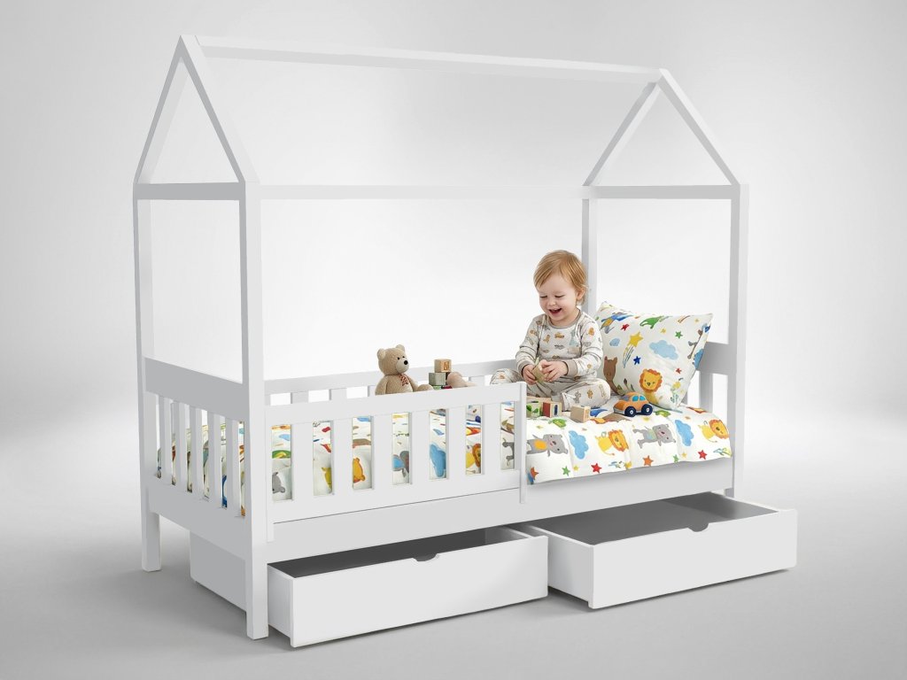 A fehér JOHNY házikó gyerekágy 90x200 cm egy olyan bútordarab, amely a gyerekek kedvence lesz. Lányos és fiús gyerekszobába is megfelelő választást jelent. A gyerekágy minőségi borovi fenyőből készül, amely garantálja az ellenálló képességét és a stabilitását. Az ágyhoz tartozó tároló fiók nem csak az ágynemű tárolására szolgál, de tárolhatja bennük a gyerekek játékait, könyveit vagy esetleg a ruháit is. A szülők biztosan értékelni fogják a leesésgátlót is, amely meggátolja, hogy a gyerekek leessenek az ágyról. Ez az egyszemélyes ágy fehér színben készül.