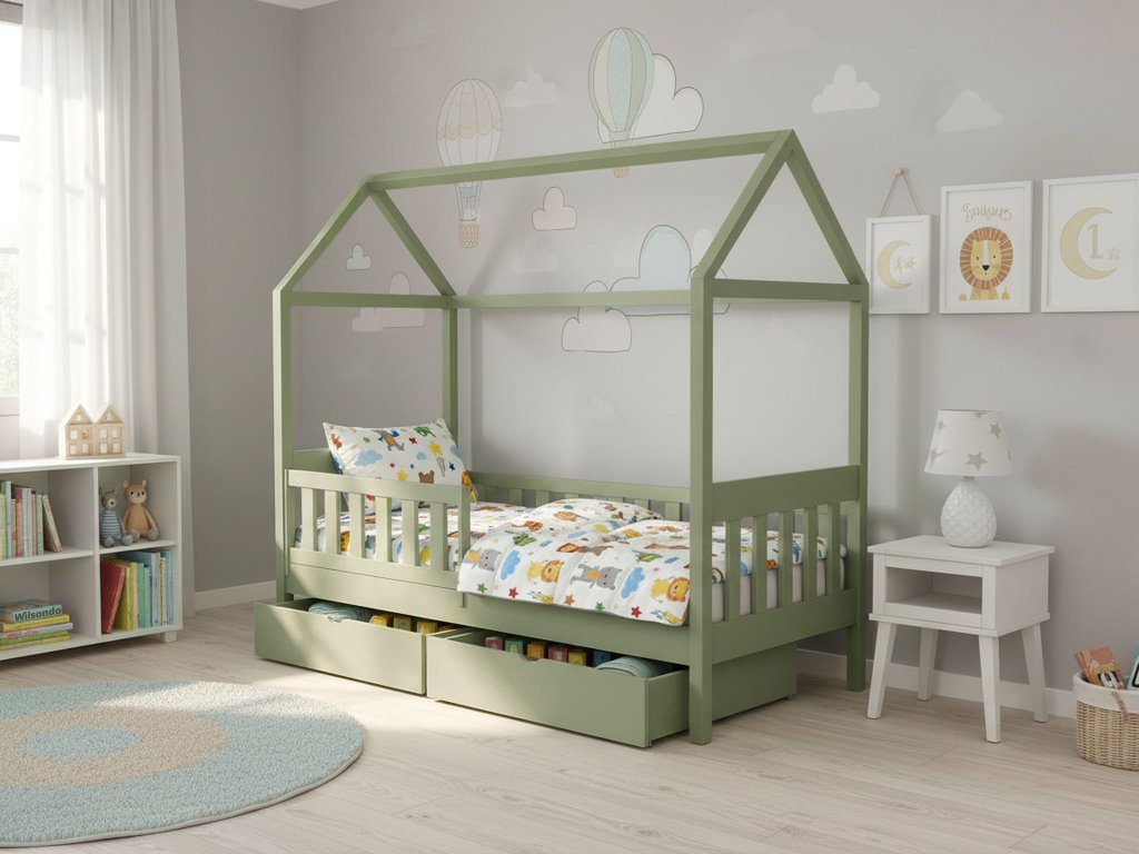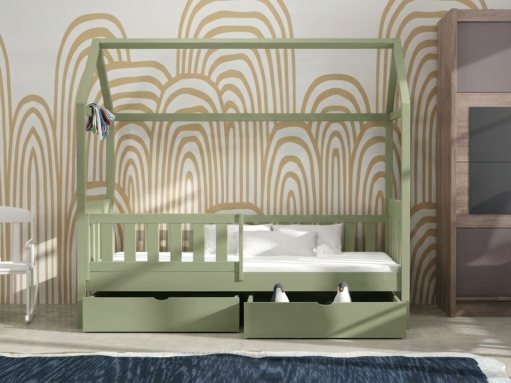 A különleges olivazöld JOHNY gyerekágy 80x180 cm egy minőségi házikó formájú ágy a gyerekszobába. Az ágyhoz tartozó tároló fiók nem csak az ágynemű tárolására szolgál, de tárolhatja bennük a gyerekek játékait, könyveit vagy esetleg a ruháit is. Ez a minőségi ágy egy olyan bútordarab, amely nem csak az Ön, de a gyerekek kedvence is lesz. Lányos és fiús gyerekszobába is megfelelő választást jelent. A gyerekágy minőségi borovi fenyőből készül, amely garantálja az ellenálló képességét és a stabilitását. A szülők biztosan értékelni fogják a leesésgátlót is, amely meggátolja, hogy a gyerekek leessenek az ágyról. Ez az egyszemélyes ágy olivazöld színben készül.