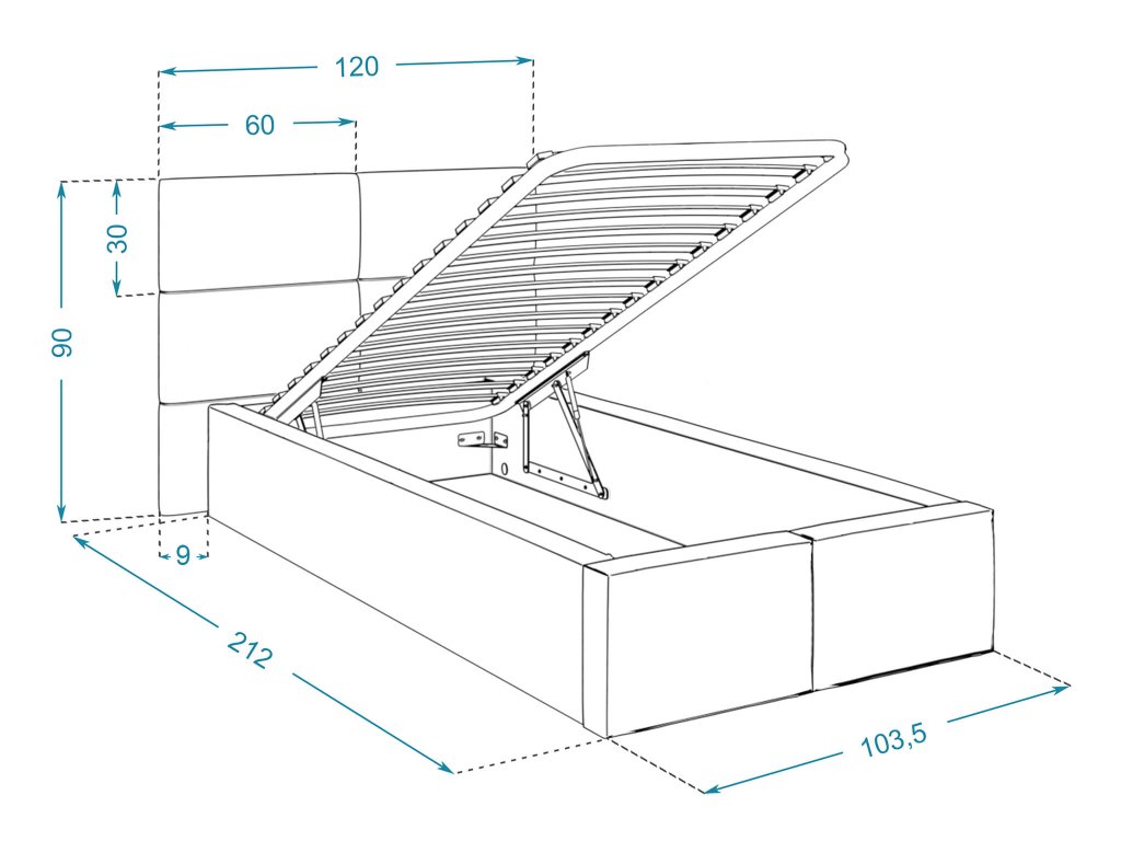 - Anyaga: Trinity szövet (100 % poliészter), DTD bútorlap szerkezet, gázrugók az ágyrács megemelésére