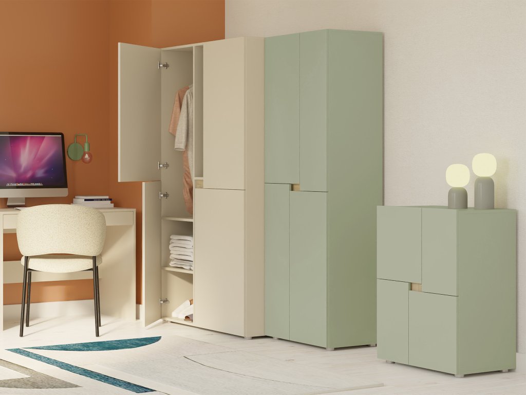 A Lens szekrény modern zöld kivitelben eleganciát és rendet visz a gyerekszobába vagy diákszobába. Elegendő helyet biztosít ruhák, iskolai felszerelések vagy játékok tárolására, így a szoba mindig rendezett és áttekinthető marad. Minőségi laminált forgácslapból készült, amely hosszú élettartamot és könnyű karbantartást garantál. Minden látható él tartós ABS élzárással védett, míg a hátoldala élzárás nélkül készül. A szekrény négy ajtóval rendelkezik standard zsanérokkal, amelyek praktikus, fogantyú nélküli nyitórendszerrel működnek; az ajtók között lévő mélyedés egyszerű megfogással nyitható. Belsejében öt tágas polc található, amelyek tökéletes szervezettséget biztosítanak minden tárolandó tárgynak.