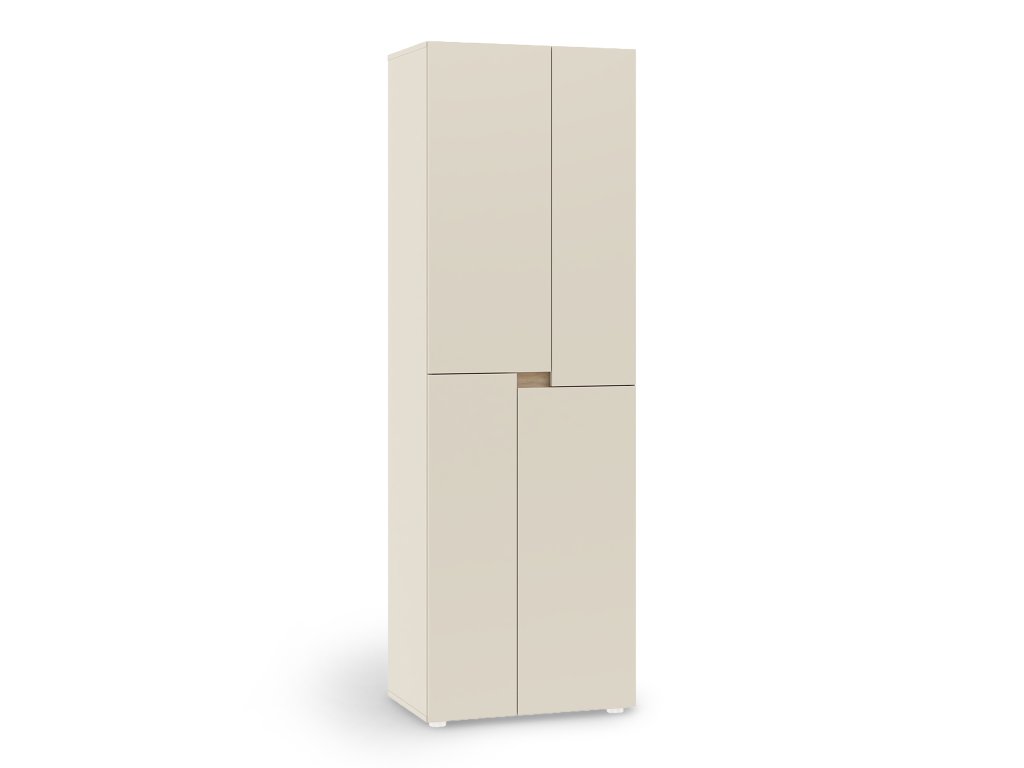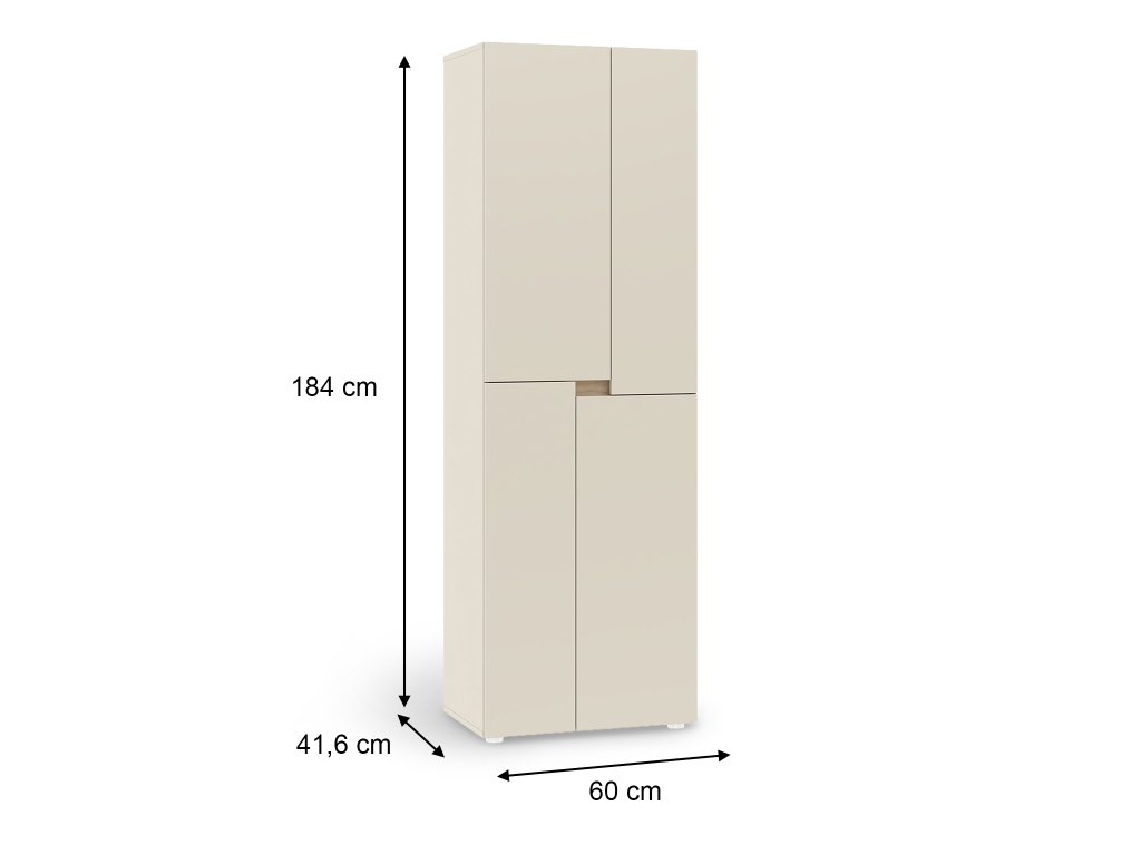 A Lens szekrény praktikus megoldást kínál ruhák, iskolai felszerelések vagy játékok tárolására gyerekszobában vagy diákszobában. Elegáns kasmírszínű árnyalata kiválóan illeszkedik bármely belső térhez, modern hangulatot kölcsönözve annak. Minőségi laminált forgácslapból készült, tartós ABS élzárásokkal, amelyek megóvják a felületet a karcolásoktól és meghosszabbítják a bútor élettartamát. A szekrény hátoldala élzárás nélkül készült. Négy ajtóval rendelkezik, standard zsanérokkal és praktikus, fogantyú nélküli nyitórendszerrel, amely egyszerűen az ajtók közötti nyíláson keresztül működik. Belsejében öt tágas polc található, amelyek elegendő helyet biztosítanak minden holmi áttekinthető és kéznél tartott tárolására. A szekrény stabilitását ezüst színű, kerek műanyag lábak biztosítják.