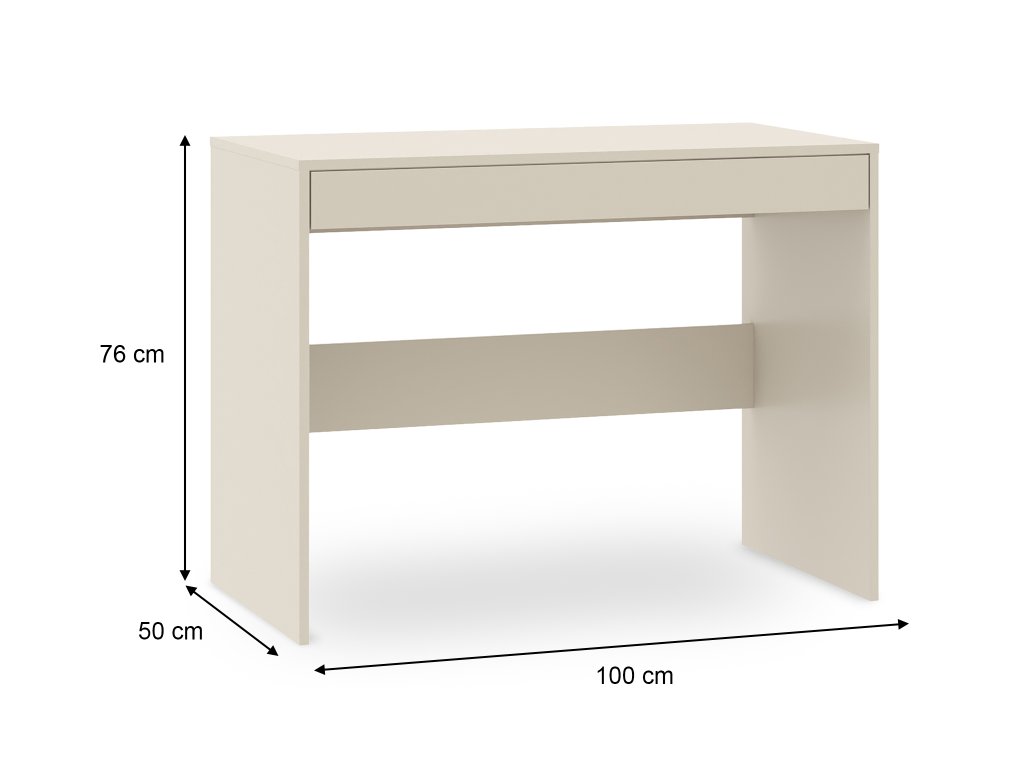 Tökéletes íróasztalt keres iskolás gyermekének? A Lens íróasztal elegáns kasmírszínben ideális megoldás a praktikus és rendezett munkaterület kialakításához a gyerekszobában vagy diákszobában. Minőségi, 16 mm vastag laminált forgácslapból készül, amely hosszú élettartamot és könnyű karbantartást biztosít. A látható élek tartós ABS élzárással vannak ellátva, míg az asztal hátoldala élzárás nélkül készült. Az asztal tágas, golyós fióksínnel szerelt fiókkal rendelkezik, amelyben gyermeke áttekinthetően tárolhatja az iskolai eszközöket, dokumentumokat vagy személyes dolgokat. A fiók nyitása fogantyú nélküli, egyszerűen a front megfogásával történik. Az asztal stabilitását műanyag lábak biztosítják fekete csúszásgátló betétekkel, melyek egyúttal védik a padlót a karcolásoktól.