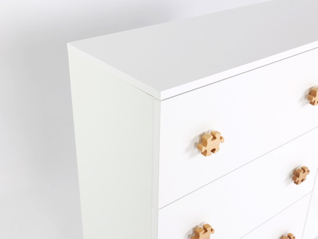 A komód puzzle alakú fa fogantyúkkal együtt kapható. A komódhoz különböző színváltozatokban vásárolhat fa illetve fém fogantyúkat.
