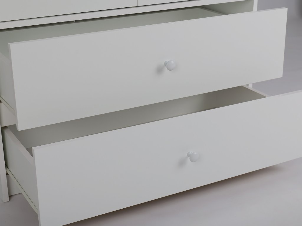 Fehér színben készült LEO L2 ruhásszekrény a gyerekszobába fehér színű letisztult fogantyúkkal. Az aljában két tágas fiókot talál. A teteje két részre osztott, az egyik részben polcok, míg a másikban egy akasztórúd található. A szekrény elegáns fogantyúk segítségével nyílik, amelyeket megtalálna kínálatunkban. Több színváltozat is rendelkezésre áll. A szekrény hátlapja kemény farostlemezből készült, és innovatív csavarokkal van rögzítve, így biztosítva a maximális stabilitást és tartósságot. A szekrény kiváló minőségű ABS élekkel van biztosítva, amely eleganciát kölcsönöz az egész szekrénynek. A Leo gardróbszekrény ideális kiegészítő minden gyerekszobába, ugyanis számos tároló helyet kínál a gyerekek ruháinak, kabátjainak. Élvezze a ruhák és kiegészítők zökkenőmentes rendszerezését ezzel az elegáns és időtlen gardróbszekrénnyel. A 180 cm-es magasságával és 90 cm-es szélességével ez a szekrény rengeteg tárolóhelyet kínál anélkül, hogy túl sok helyet foglalna a szobában.