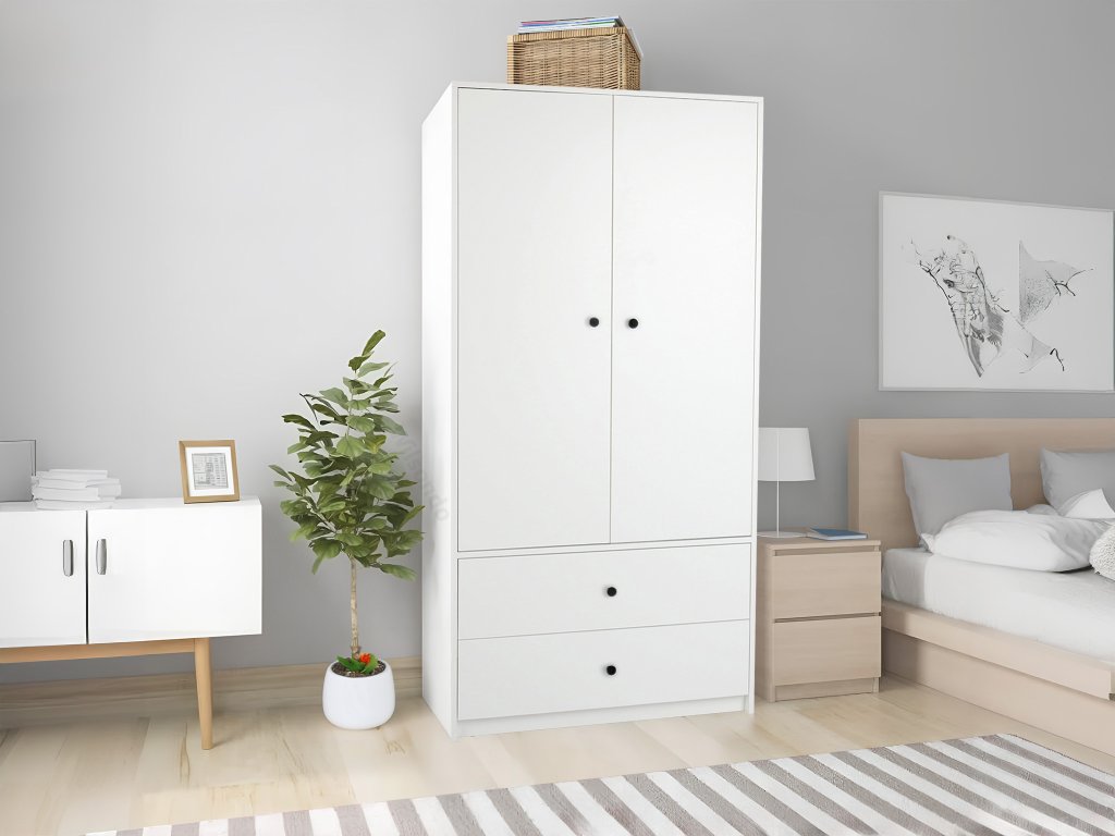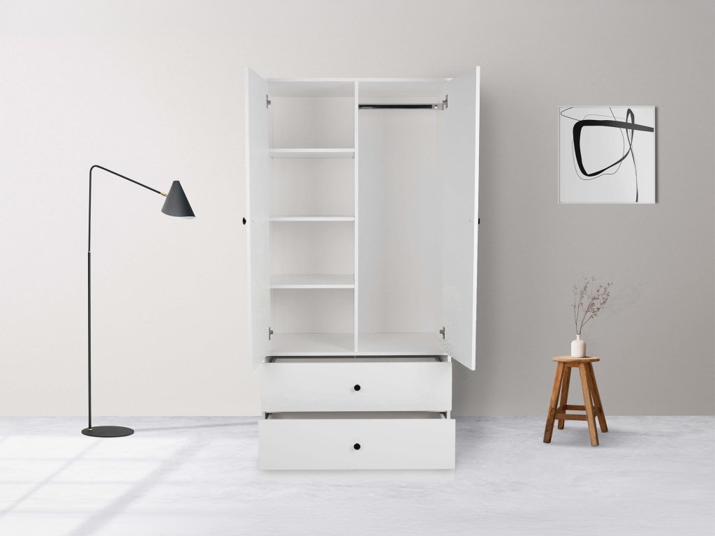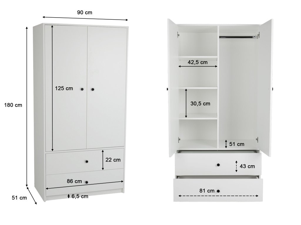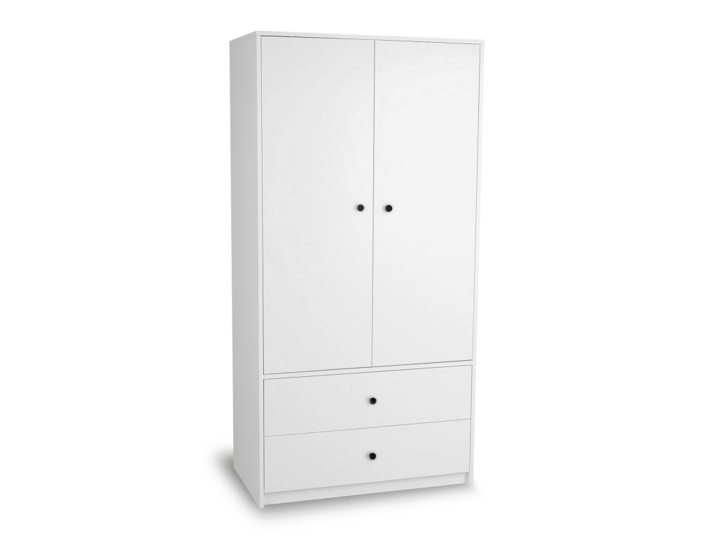 Fehér színben készült LEO L2 ruhásszekrény a gyerekszobába fekete színű letisztult fogantyúkkal. Az aljában két tágas fiókot talál. A teteje két részre osztott, az egyik részben polcok, míg a másikban egy akasztórúd található. A szekrény elegáns fogantyúk segítségével nyílik, amelyeket megtalálna kínálatunkban. Több színváltozat is rendelkezésre áll. A szekrény hátlapja kemény farostlemezből készült, és innovatív csavarokkal van rögzítve, így biztosítva a maximális stabilitást és tartósságot. A szekrény kiváló minőségű ABS élekkel van biztosítva, amely eleganciát kölcsönöz az egész szekrénynek. A Leo gardróbszekrény ideális kiegészítő minden gyerekszobába, ugyanis számos tároló helyet kínál a gyerekek ruháinak, kabátjainak. Élvezze a ruhák és kiegészítők zökkenőmentes rendszerezését ezzel az elegáns és időtlen gardróbszekrénnyel. A 180 cm-es magasságával és 90 cm-es szélességével ez a szekrény rengeteg tárolóhelyet kínál anélkül, hogy túl sok helyet foglalna a szobában.