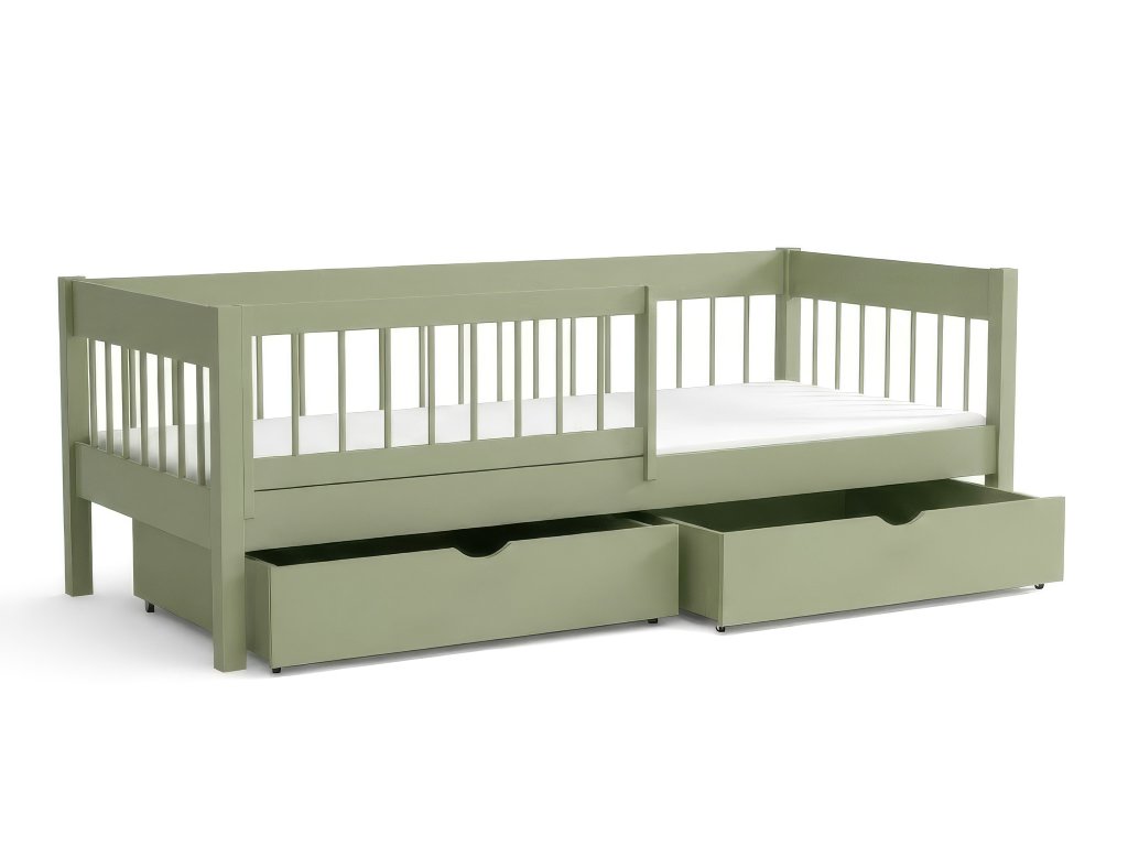 Az ágyhoz tartozik két praktikus ágyneműtartó tároló fiók, amelyek kerekeken mozgathatók. A csomag része továbbá a masszív ágyrács, valamint egy praktikus, levehető leesésgátló, amely az első időszakban extra védelmet nyújt. A leesésgátló később egyszerűen eltávolítható. A tömör fenyőfa szerkezetnek köszönhetően az ágy akár 120 kg terhelést is elbír, így ha gyermeke mellett szeretne feküdni az esti mesemondás vagy az elalvás előtt, gondtalanul megteheti.