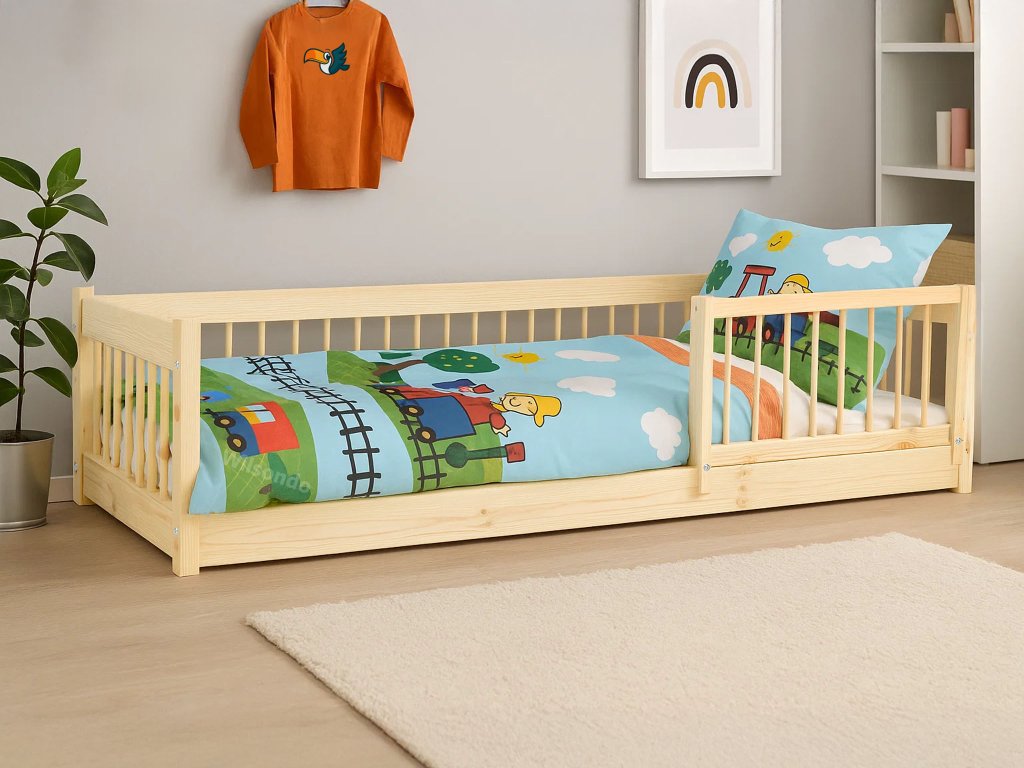 Lesanka 90x200 fenyőfa ágy természetes fenyő árnyalatban ötvözi a tömör fa szépségét, praktikusságát és biztonságát a gyermekek számára. Közvetlenül a földön helyezkedik el, ami növeli a stabilitást és minimalizálja az éjszakai mozgás közbeni leesés kockázatát. Az alacsony kialakítás a Montessori filozófiából merít, amely támogatja az önállóságot és lehetővé teszi a gyermek számára, hogy szabadon felfedezze a terét.