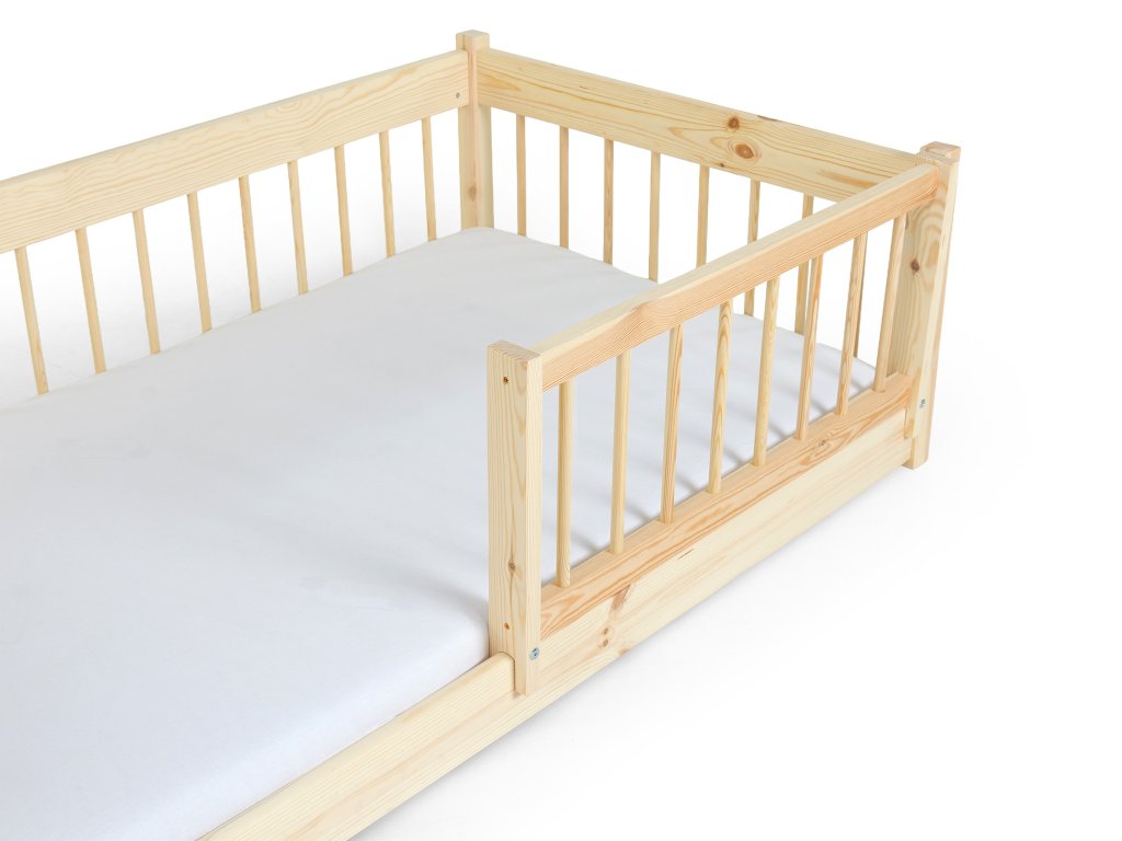 A gyerekágy 100% fenyő tömörfából készült, amely kiemelkedik szilárdságával, tartósságával és gyönyörű szerkezetével. A felületet környezetbarát, vízbázisú lakkal kezelték, amely megőrzi a fa autentikus rajzolatát és teljesen biztonságos a gyermekek számára. Az ágy minőségi ágyráccsal és levehető korláttal együtt érkezik, amelyet igény szerint lehet igazítani – például az első években védelemként, később szabad bejáratként az ágyba. A 90x200 cm-es méretének köszönhetően univerzális ágy, amely több évig szolgálja a gyermeket. Elég tágas a kényelmes alváshoz és a közös meseolvasáshoz is. A finom fenyő árnyalat meleg és természetes légkört kölcsönöz a gyerekszobának, amely illik a modern és a rusztikus kiegészítőkhöz is.