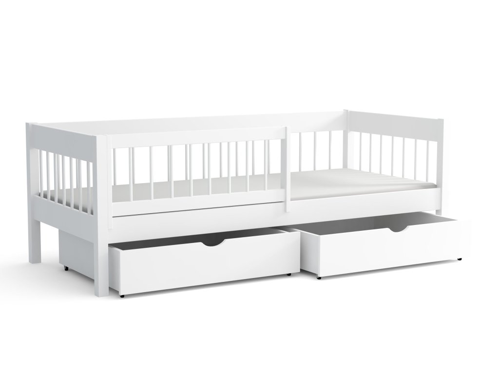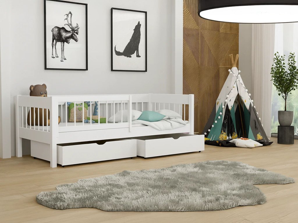 Azok számára, akik a stílus, a praktikum és a biztonság ötvözetét keresik, a fehér Lesanka ágy ideális választás. Az univerzális fehér szín tiszta, légies hatást kelt, és optikailag világosabbá teszi a kisebb gyerekszobákat is. A fenyőfából készült masszív szerkezetnek köszönhetően az ágy stabilitást és hosszú élettartamot kínál, így megbízható társ lesz gyermekének évekig. Az ágy alatt található két nagy fiók, amelyekbe könnyedén elhelyezheti a játékokat, ágyneműt vagy ruhákat – praktikus megoldás, amely helyet takarít meg és segít rendet tartani a szobában.