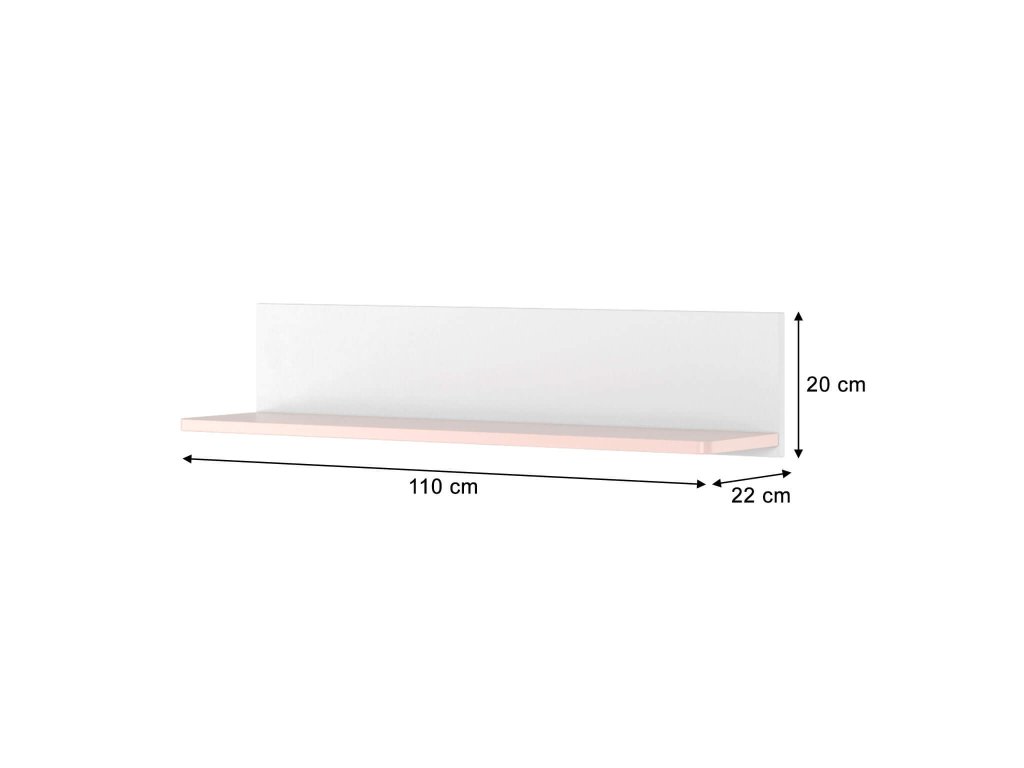 LUNA fali polc fehér és púderrózsaszín kombinációban, amely gyönyörűen kiegészíti a kollekció többi bútor darabját. 110 cm hosszúságának köszönhetően elhelyezheti rá a könyveket vagy családi képeket. Teherbírása 5 kg.