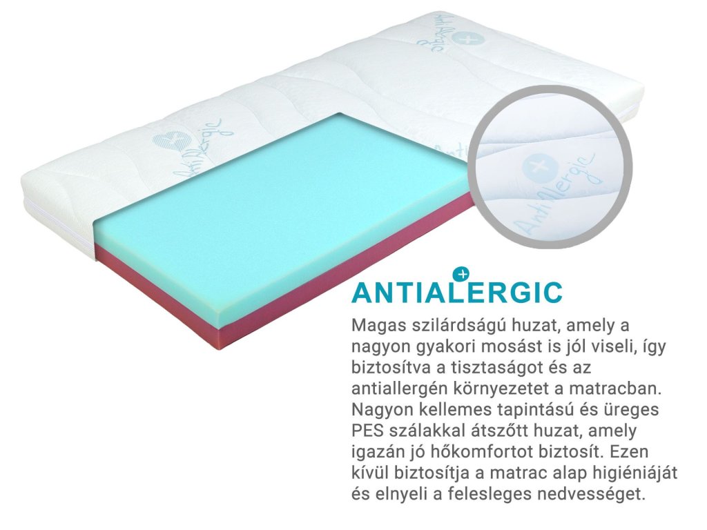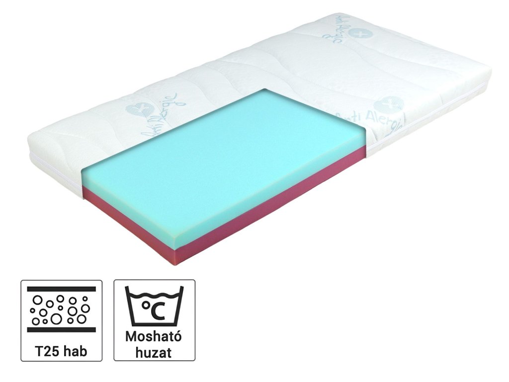 A két különböző keménységű és nagysűrűségű pur habok szendvics összetétele biztosítja az ágybetét számára a szükséges szilárdságot és tartósságot. Antiallergén cipzáras huzattal rendelkezik, amely könnyű karbantartást és higiéniát tesz lehetővé. A matrachuzat levehető és 60 °C-on mosógépben mosható.
