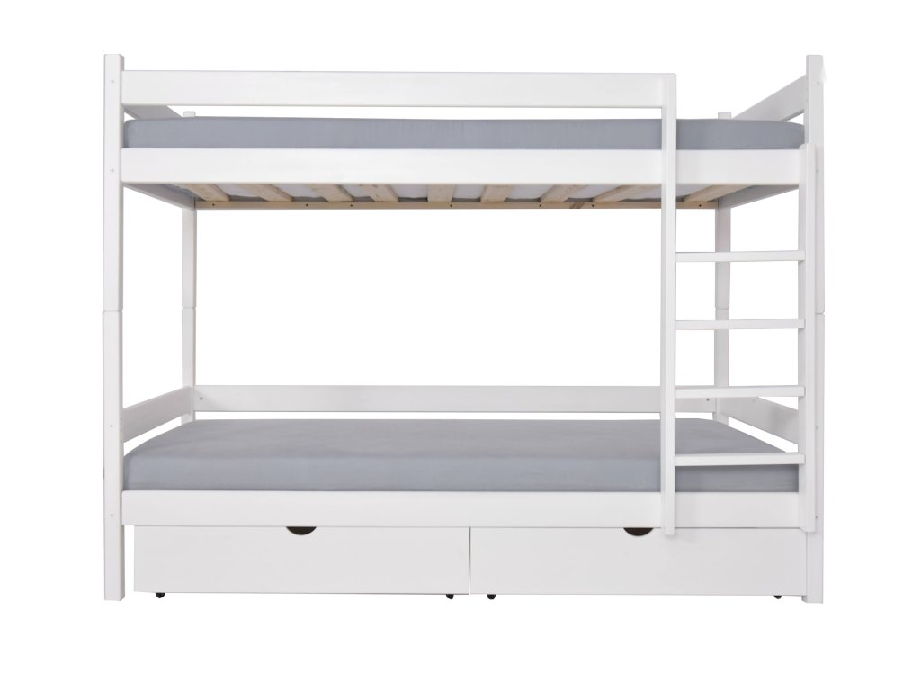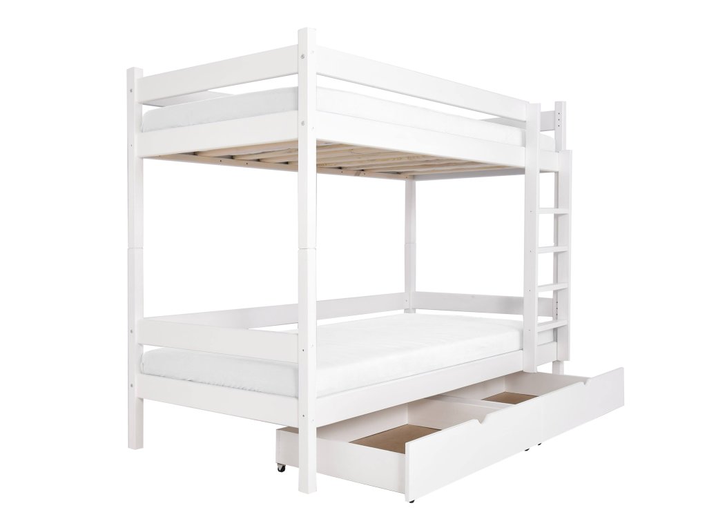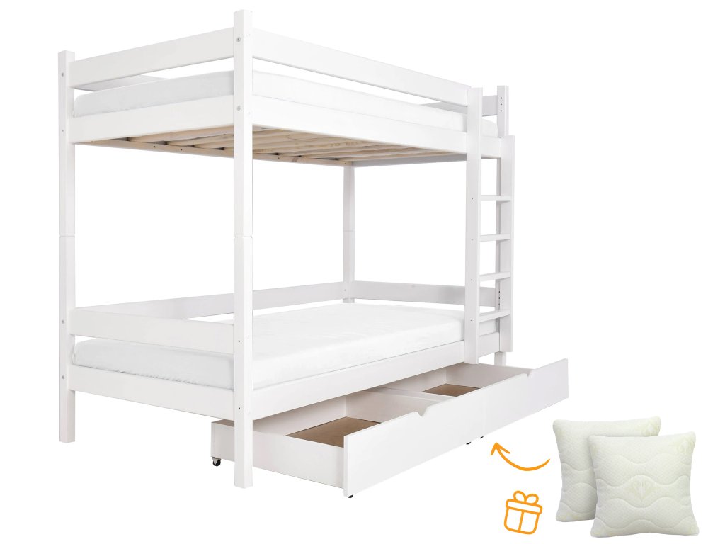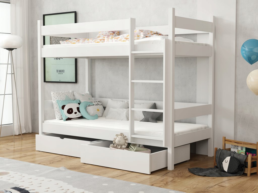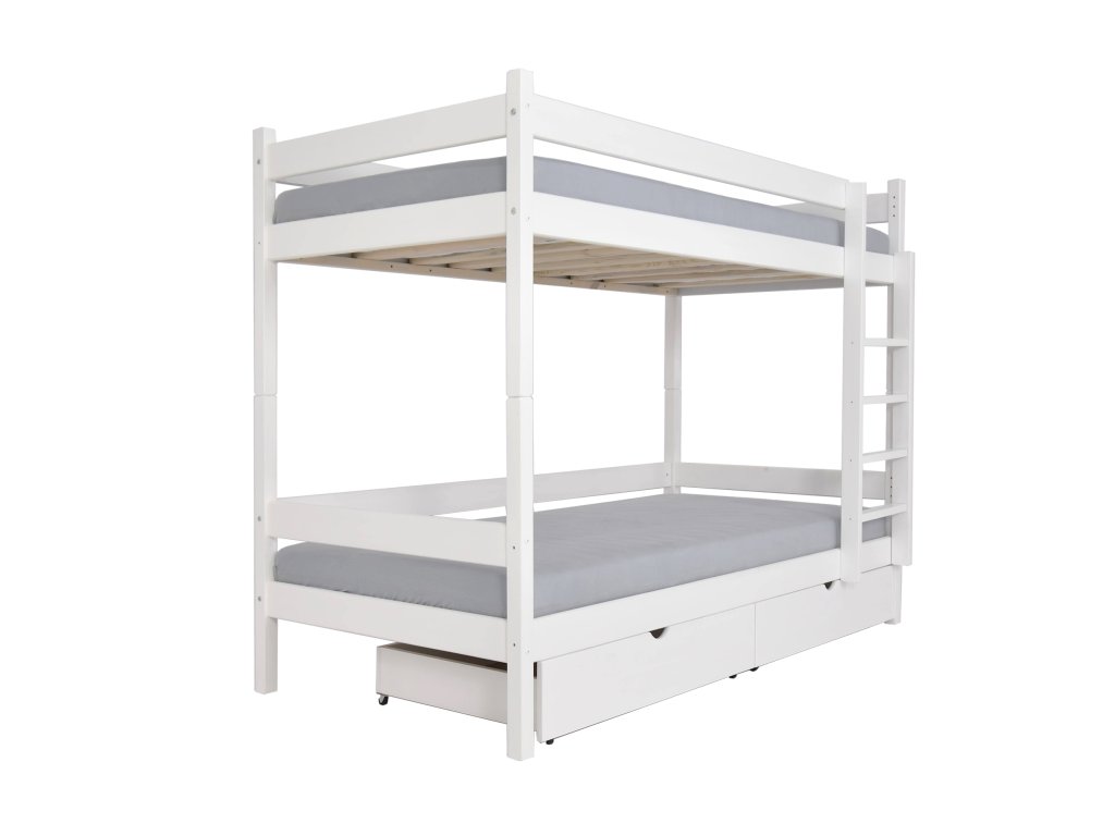 A PAULA 2 emeletes ágy tömör borovi fenyőből készült. A gyönyörű fa emeletes ágy részét képezik a tároló fiókok. Tömör borovi fenyőből készült, a szerkezete erős. Az emeletes gyerekágyak 3x vannak lakkozva ökológiai lakkal. Különböző színekben elérhető! Az ágy szélei le vannak kerekítve, hogy ne okozzanak sérülést. Az ágy szétszedhető 2 önálló fekhelyre. Az ágyrácsok szintén erős tömör fából készültek. Az ágy kétoldalas, jobb és bal oldalra is szerelhető a létra. Lehetőség van leesésgátló vásárlására az alsó fekhelyre, a felső fekhelyen a leesésgátló az ágy része. Az ágy teherbírása 100 kg / fekhely. Az ágy 2 tároló fiókot tartalmaz, melyek kerekeken mozognak, hogy ne okozzanak sérülést a padlón és biztosítják a könnyű mozgatást.