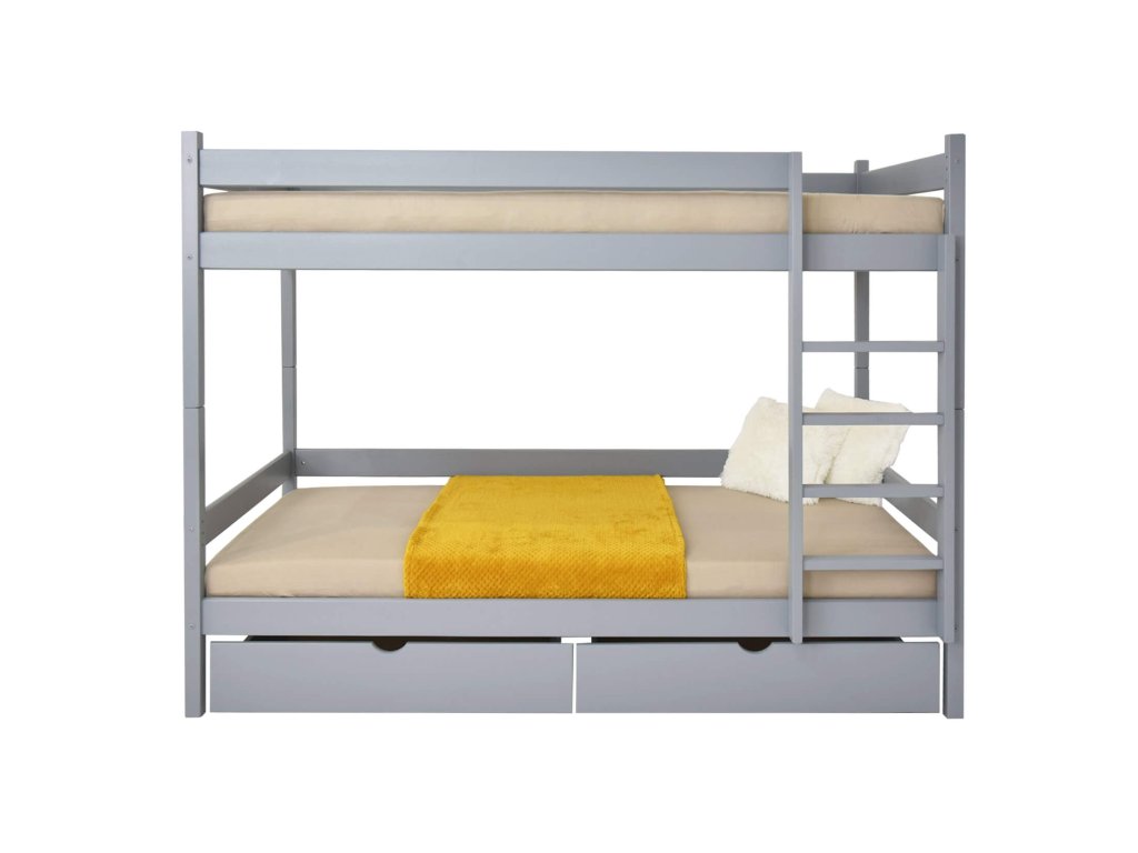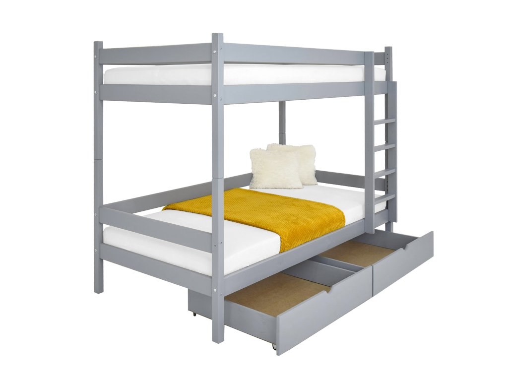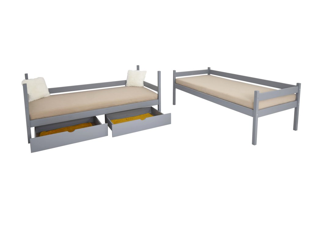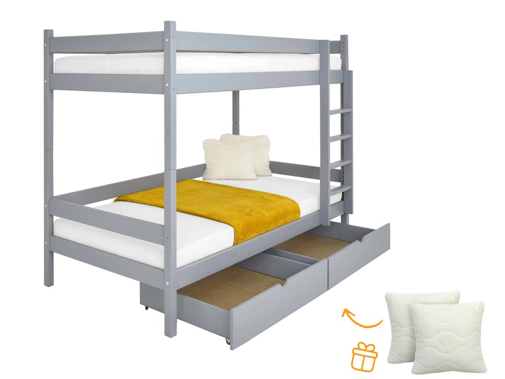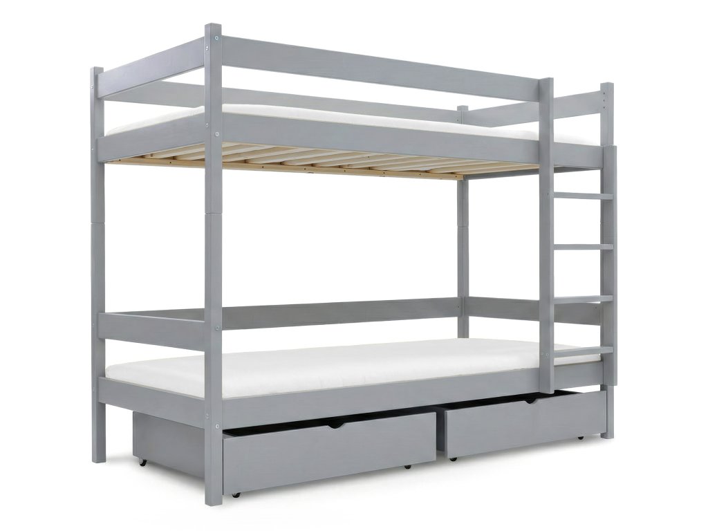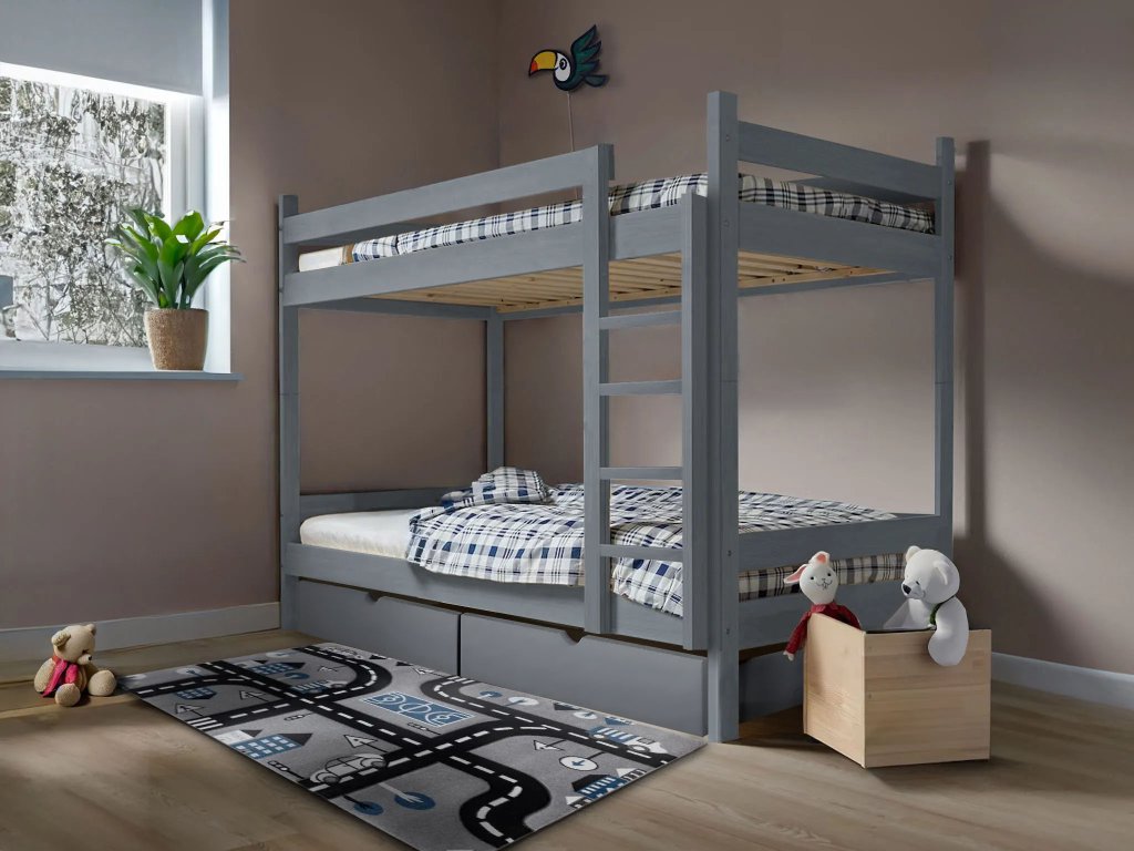 A PAULA 2 szürke emeletes ágy ágyneműtartóval tömör borovi fenyőből készült. A gyönyörű fa emeletes ágy részét képezik a tároló fiókok. Az ágy tömör borovi fenyőből készült, a szerkezete erős. Az emeletes gyerekágyak 3x vannak lakkozva ökológiai lakkal. Különböző színekben elérhető! Az ágy szélei le vannak kerekítve, hogy ne okozzanak sérülést. Az ágy szétszedhető 2 önálló fekhelyre. Az ágyrácsok szintén erős tömör fából készültek. Az ágy kétoldalas, jobb és bal oldalra is szerelhető a létra. Lehetőség van leesésgátló vásárlására az alsó fekhelyre, a felső fekhelyen a leesésgátló az ágy része. Az ágy teherbírása 100 kg/fekhely. Az ágy 2 ágyneműtartó tároló fiókot tartalmaz, melyek kerekeken mozognak, hogy ne okozzanak sérülést a padlón és biztosítják a könnyű mozgatást.
