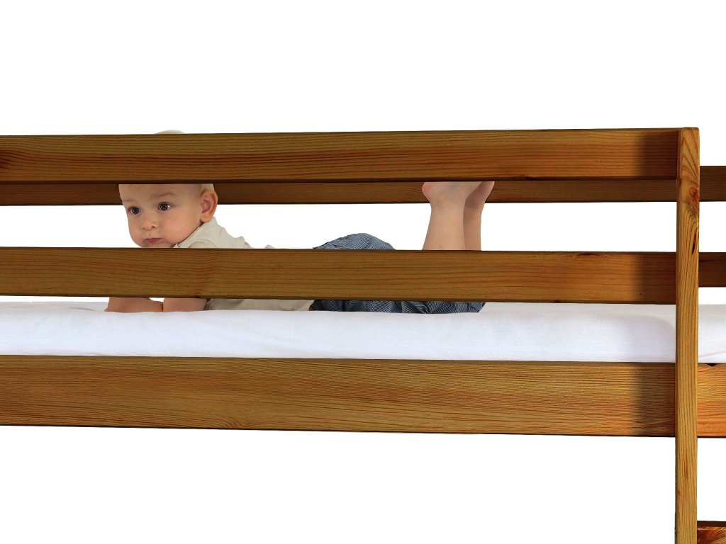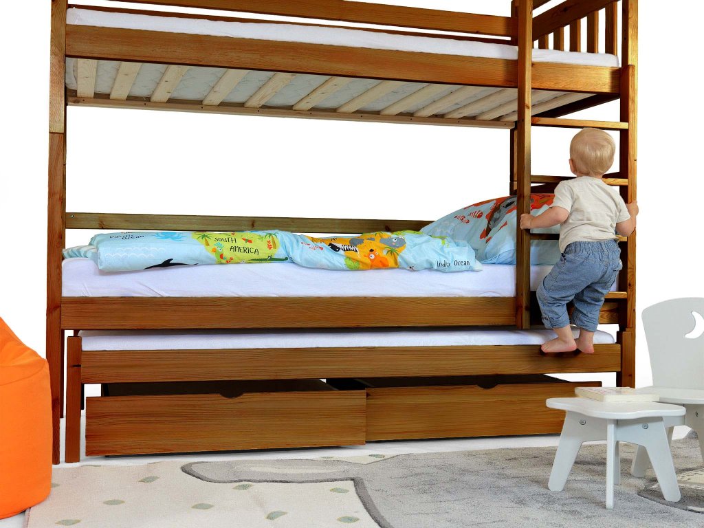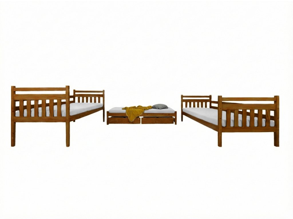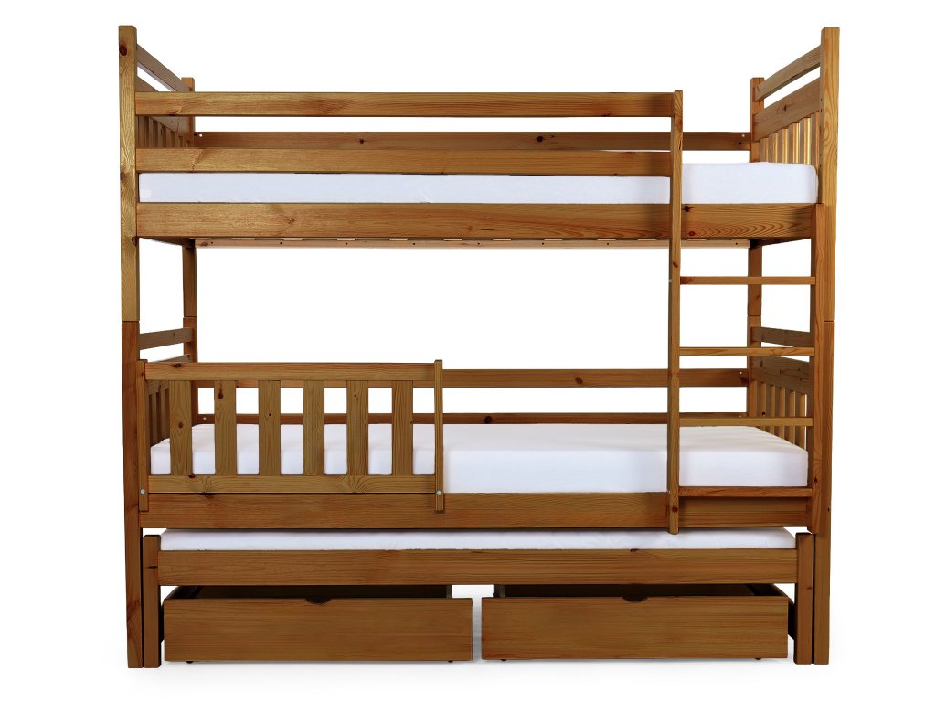 Petra 5 stabil és minőségi emeletes ágy kihúzható vendégággyal tömör borovi fenyőből tölgy színre lakkozva. A tömör fa szerkezete biztosítja, hogy az idő múlásával sem válik instabillá. Az ágy natúr fa - borovi fenyő néhányszor lakkozva ökológiai lakkal. A háromszemélyes emeletes ágy szétszedhető 3 különálló fekhelyre. Az ágyrácsok szintén erős tömör fából készültek, amelyek biztosítják az ágy teherbíró képességét egészen 100 kg-ig.
