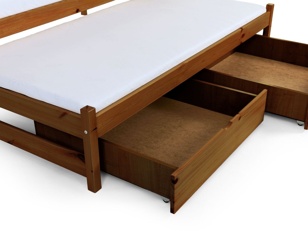 Az ágy 2 ágyneműtartó fiókot tartalmaz, amelyek műanyag kerekeken mozognak, hogy ne okozzanak sérülést a padlón. Nagyon könnyű a kezelésük. A pótágy kihúzható és így egy harmadik, teljes értékű fekhely alakítható ki. A pótágy hátsó lábaira gumikerekek vannak rögzítve, melyek lehetővé teszik a könnyű kezelését, vagyis a kihúzását és a betolását. Az ágy univerzális, tehát kétoldalas. Szerelés előtt döntheti el, hogy jobb vagy bal oldalra szeretné szerelni a létrát. Az ágy leesésgátlóval együtt kapható. A tároló fiók nem tölti ki az ágy teljes alsó részét, kisebb annál, a fotó csak illusztrációs jellegű.