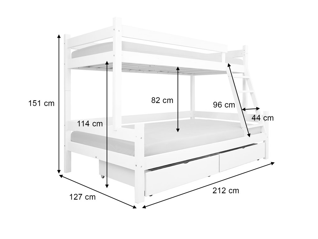 Rendkívül eredeti PETRA 6 tömör fa emeletes ágy kiszélesített alsó fekhellyel (200 x 120 cm). Az ágy natúr borovi színű és 3x van lakkozva színtelen ökológiai lakkal, amely nem ártalmas sem a környezetre, sem az egészségre. Az ágy 2 ágyneműtartó tároló fiókot tartalmaz, amelyek műanyag kerekeken mozgathatóak, így nem okoznak sérülést a padlón. Nincsenek rögzítve az ágyhoz, tehát nagyon könnyű a mozgatásuk.Az ágy teherbírása 100 kg/fekhely. Ez az emeletes ágy nem alakítható át két különálló fekhellyé. Az ágy univerzális, tehát kétoldalas. Összeszerelés előtt döntheti el, hogy jobb vagy bal oldalra szeretné szerelni a létrát.