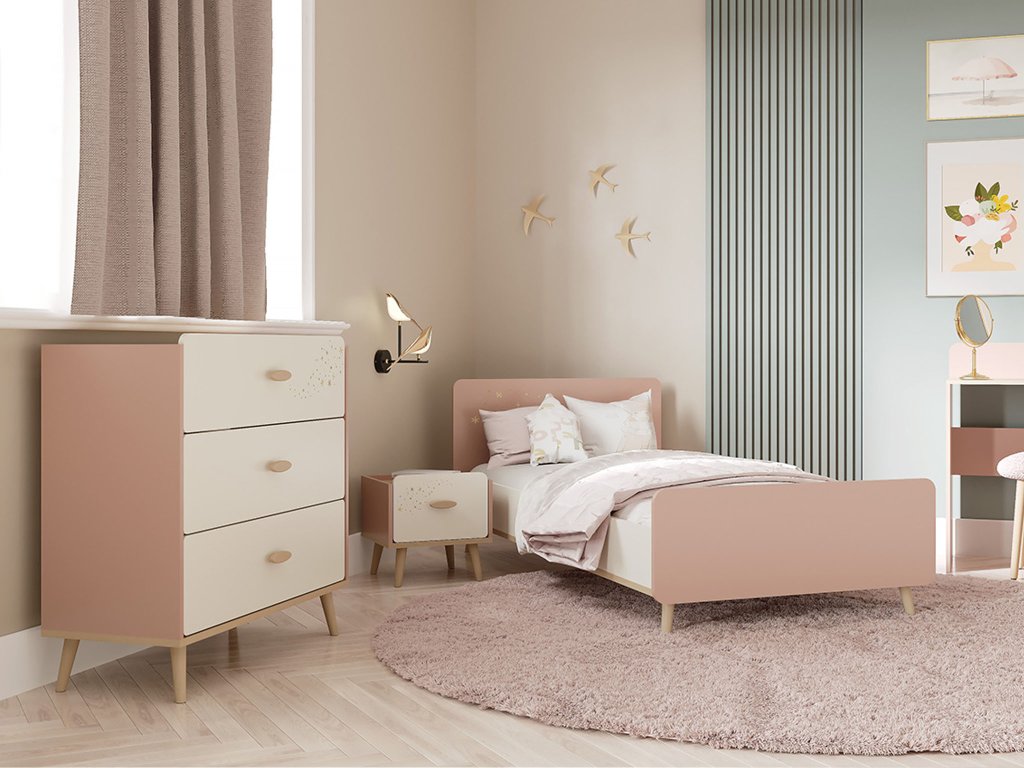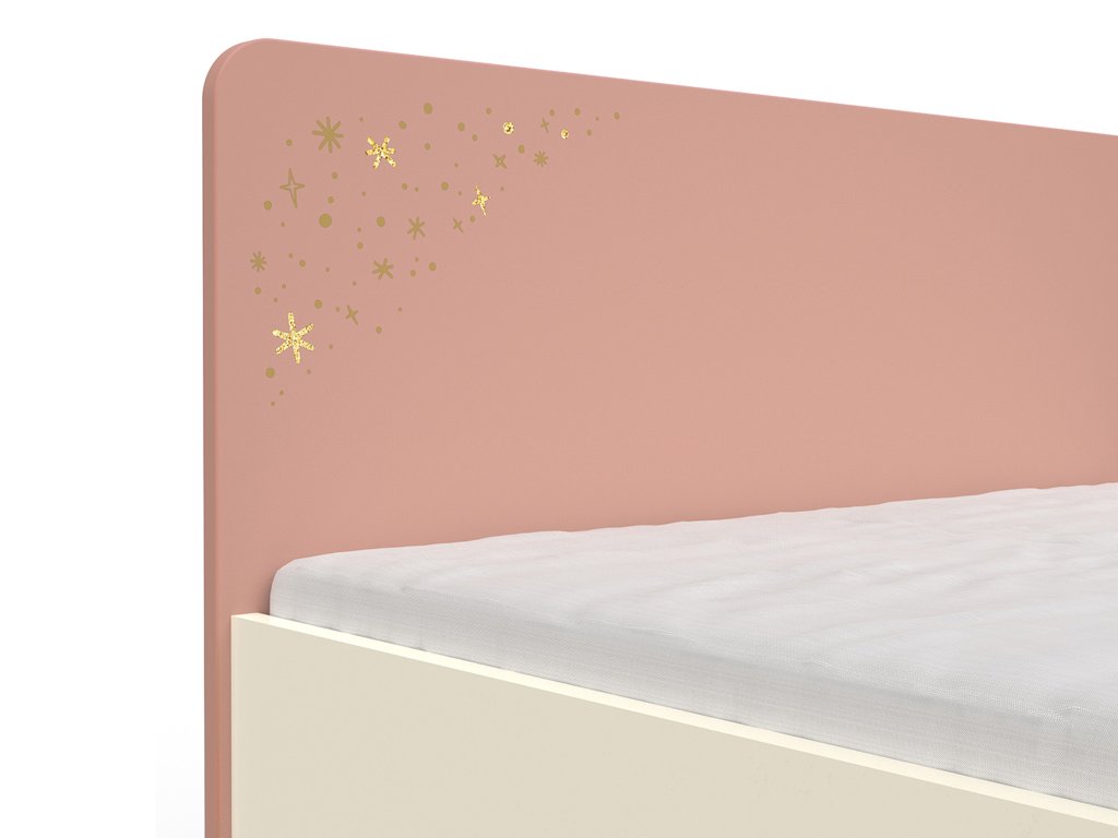 A Suzie gyerekágy nemcsak praktikus alvási megoldást kínál kislánya szobájába, hanem elbűvölő, mesebeli dizájnjával is különlegessé varázsolja a teret. A finom rózsaszín és krém részletek kombinációja életet visz a szobába, és meghitt, barátságos atmoszférát teremt. Az ágy fejvégét bájos csillagmotívum díszíti, amely egyedi és játékos megjelenést kölcsönöz a bútornak. A stabilitást és tartósságot a tömör tölgyfából készült lábak garantálják.