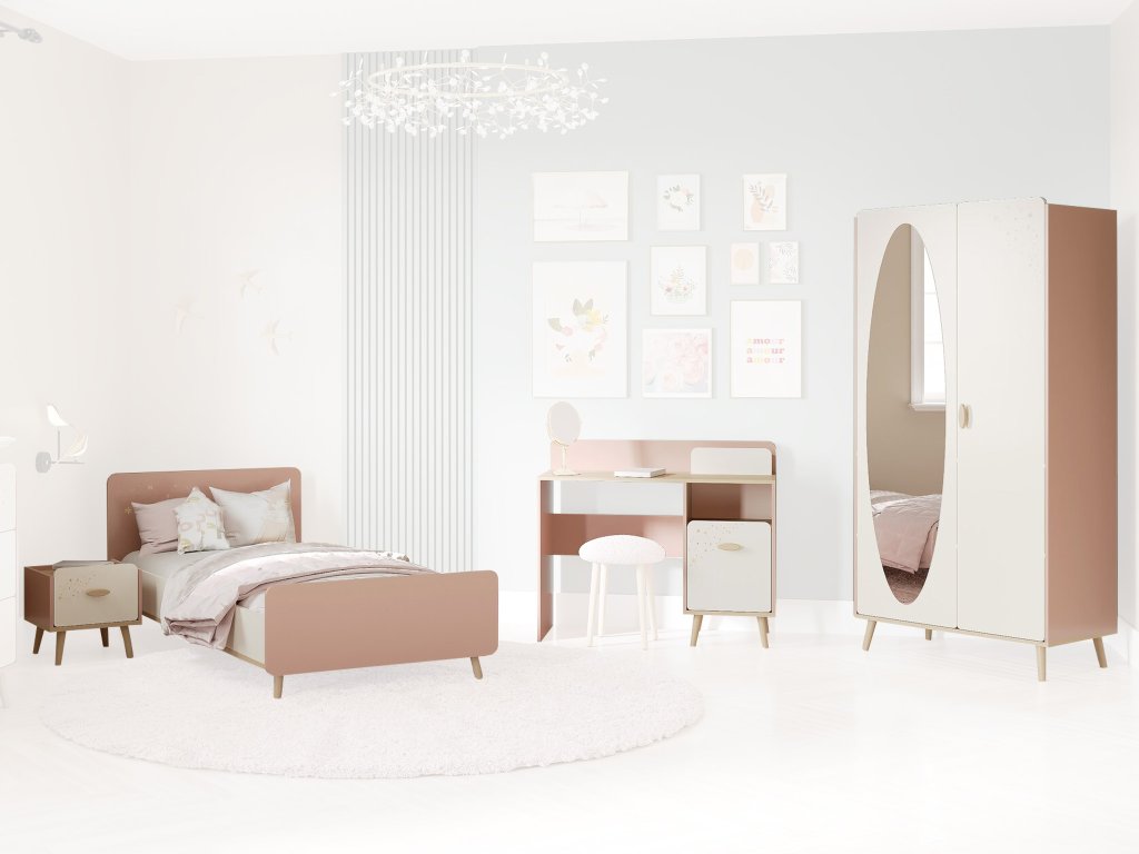 A Suzie gyerekszoba minden kislány beteljesült álma, aki saját varázslatos birodalomra vágyik. Finom rózsaszín és krémszín árnyalatai, valamint a játékos csillagmotívum mesebeli, elegáns légkört teremtenek. Ez a garnitúra tartalmazza:
