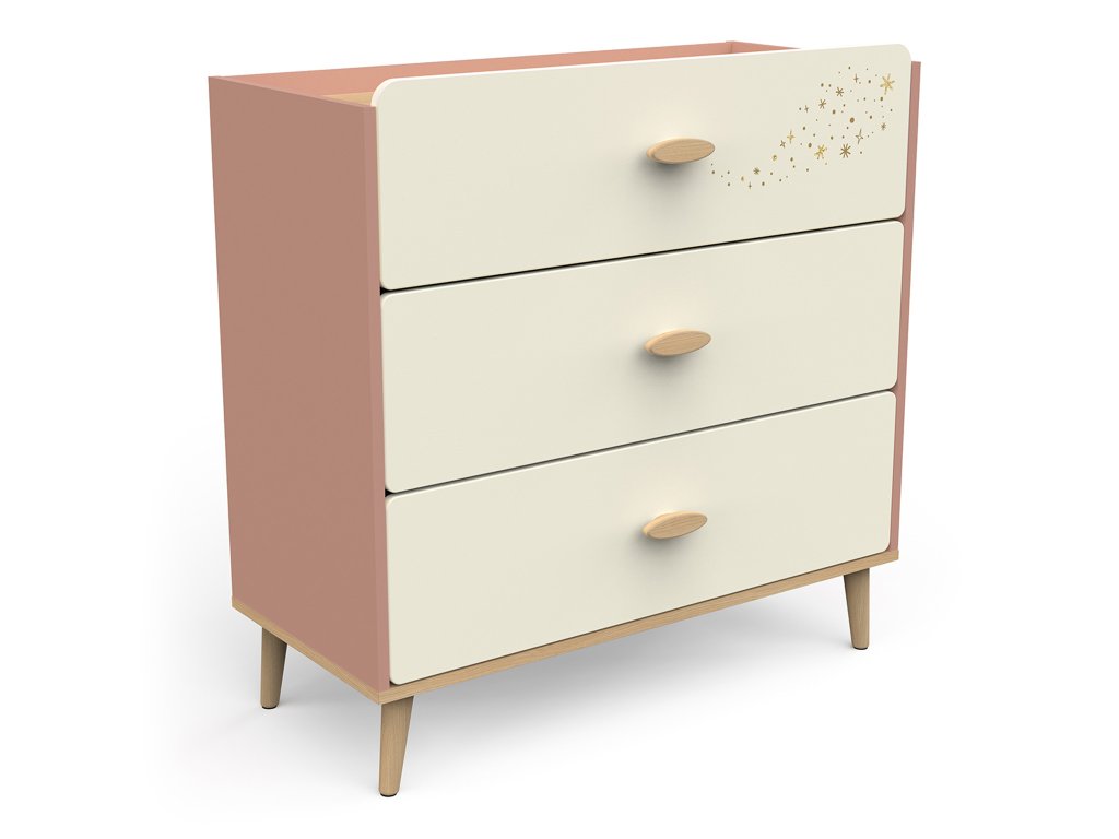 Dobja fel kislánya szobáját a Suzie komóddal, amely a praktikumot mesés dizájnnal ötvözi. A finom rózsaszín és krémszín árnyalatok otthonos és barátságos hangulatot teremtenek, a csillagmotívum pedig játékos és egyedi megjelenést biztosít. Három tágas fiók bőséges helyet kínál ruhák, játékok vagy iskolaszerek tárolására, míg a felső felület tökéletes lámpának, könyveknek vagy dekorációknak. A komód minőségi anyagokból készül, stabilitását a masszív tölgyfa lábak adják. Robusztus kialakításának köszönhetően ez a stílusos bútordarab hosszú éveken át szolgálja majd a gyerekszobát.