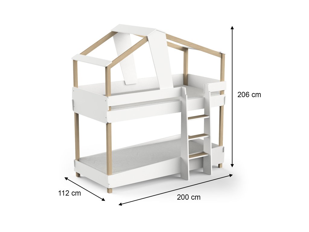A Timber emeletes ágy mesés hangulatot visz a gyerekszobába, ahol a játék, a fantázia és a feledhetetlen kalandok kerülnek főszerepbe. Házikó formájú kialakításának köszönhetően a szoba otthonos térré válik, ahol a gyermekek biztonságban és kényelmesen érezhetik magukat – akár alváshoz, akár játékhoz, akár könyvolvasáshoz használják. Ez a praktikus ágy kiváló választás testvérek számára, vagy ha helyet szeretne megtakarítani a szobában. Az ágy stabil létrával van felszerelve, amely biztonságos és egyszerű feljutást tesz lehetővé a felső fekvőhelyre. Masszív szerkezete tömör borovi fenyőből és minőségi MDF lapból készül, ami garantálja a tartósságot és hosszú élettartamot. Az ágy felületét vízbázisú, nem toxikus festékkel kezelték, így hozzájárul az egészséges beltéri levegőhöz, és teljesen biztonságos a gyermekek számára. Az elegáns fehér szín és a természetes fa árnyalat finom, légies összhatást kelt. A Timber gyerekágy bármely szoba dísze lehet, függetlenül attól, hogy lány vagy fiú lakja.