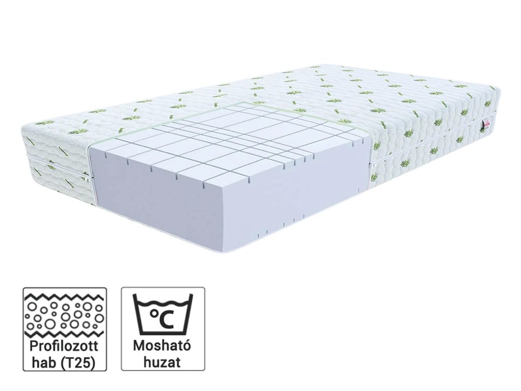 Cserélje le a régi és kifeküdt matracát egy újra. Hozzon létre egy tökéletes helyet a pihenésre egy fárasztó nap után a minőségi vastag GYMAL 80x200 cm segítségével. Ez a matrac magas rugalmasságú T25-ös sűrűségű poliuretán habból készült, amely biztosítja az igazi kényelmet alvás során. A hab cellás szerkezetű, amelynek köszönhetően a matrac tökéletes alátámasztást nyújt a testnek. Az anyagok igen tartósak és ellenállóak a deformációkkal szemben. A hab porózus szerkezete biztosítja a levegő tökéletes áramlását és megakadályozza a baktériumok és a gombák elszaporodását. A hosszanti és a keresztirányú bevágásoknak köszönhetően a matrac 7 zónára van osztva, így tökéletesen idomul az emberi test sziluettjéhez. A vágással rendelkező részek ortopéd tulajdonságokkal rendelkeznek. Minőségi Aloe Vera huzattal rendelkezik, amely nagyon puha és nem mindennapi frissességet és kényelmet biztosít. A huzat antiallergén tulajdonságokkal rendelkezik, melynek köszönhetően allergiások számára is megfelelő. A kényelmes huzat cipzárral rendelkezik, így könnyen levehető és mosógépben mosható 30°C-on. A matrac kétoldalas, miközben mindkét oldal ugyanolyan keménységgel rendelkezik.