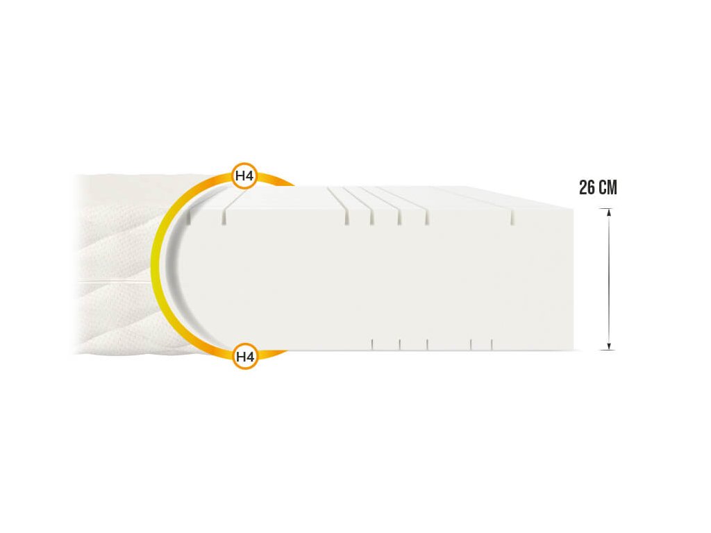 Kiváló minőségű, 7 zónás hab profilozott szerkezettel, amelyet úgy terveztek, hogy támogassa a megfelelő vérkeringést és az izmok ellazulását alvás közben. Reagál a testhőmérsékletre, ami lehetővé teszi, hogy alkalmazkodjon a test kontúrjaihoz, ezáltal javítva az alvás kényelmét. A különböző zónák eltérő keménységi rendszere optimális támaszt nyújt a gerincnek, és biztosítja a test természetes pozícióját. Ez az anyag allergiában szenvedők számára is ideális választás.
